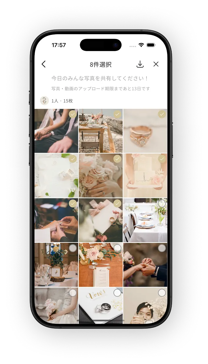 ゲストが撮った写真をリアルタイムで共有し、みんなの視点で結婚式の思い出を一冊のアルバムにまとめられます。結婚式の様々な瞬間を、参加者全員で記録できます。